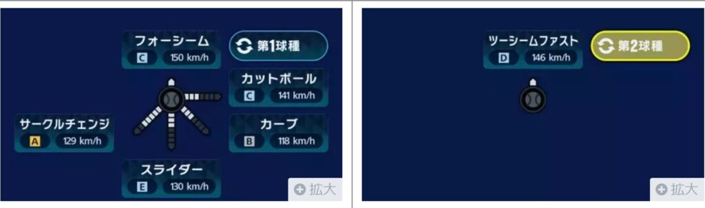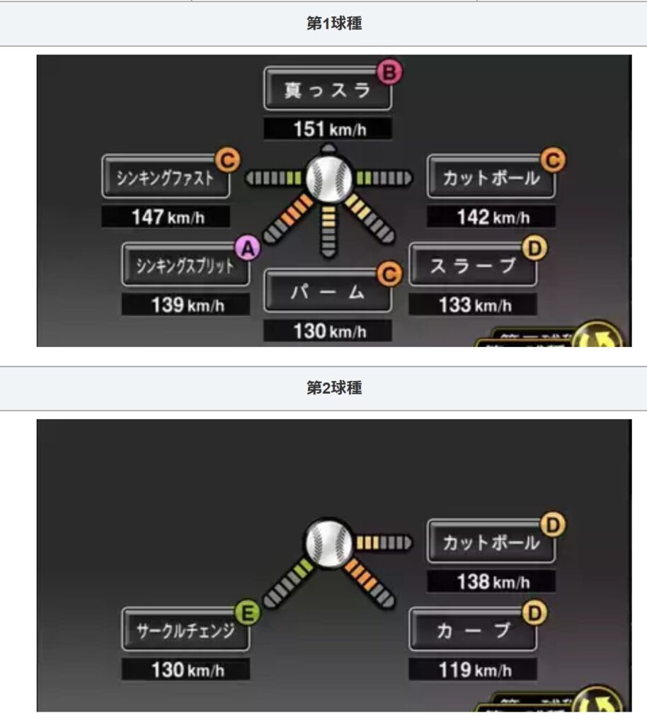 日本でR.スアレスのようなタイプは、床田寛樹だろう。参考にスアレスのメジャスピでの球種データと、床田のプロスピでの球種データは以下の通り